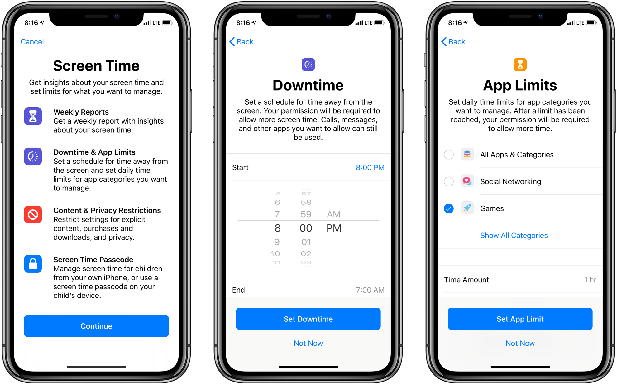- Communication Limits: limited to Apple communication apps, such as Phone, FaceTime, and iMessage; allows users to schedule a communication downtime where they can block off contacts for a certain amount of time